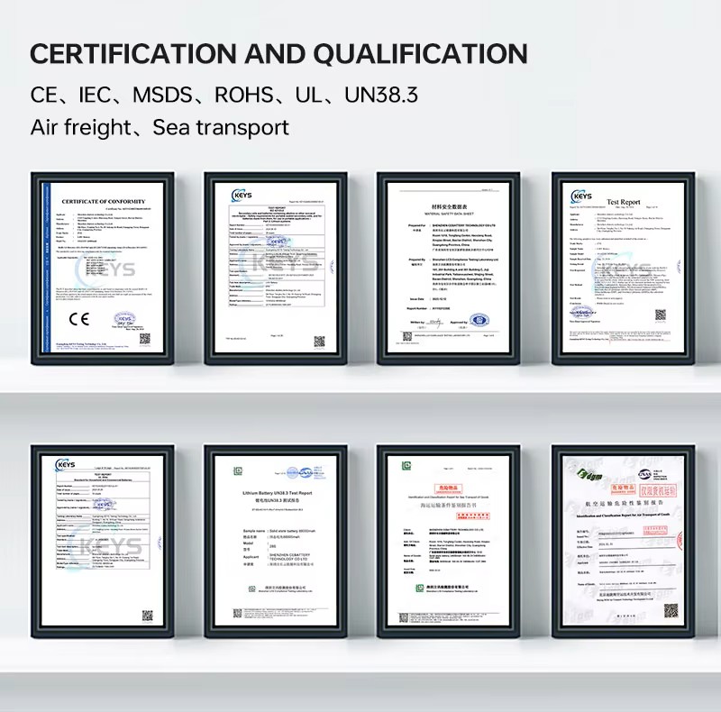 ہمارانئی ٹھوس ریاست کی بیٹریاںحفاظت اور وشوسنییتا کو یقینی بناتے ہوئے ، بین الاقوامی معیارات کو پورا کرنے کے لئے سند یافتہ ہیں: